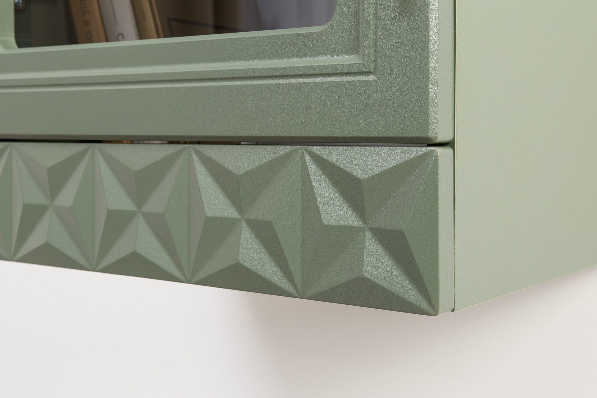 Гостиная Марион композиция 2 дымчатый зеленый K521, олива шагрень AG 1050 ПВХ, белый PE шагрень (собирается на любую сторону)
