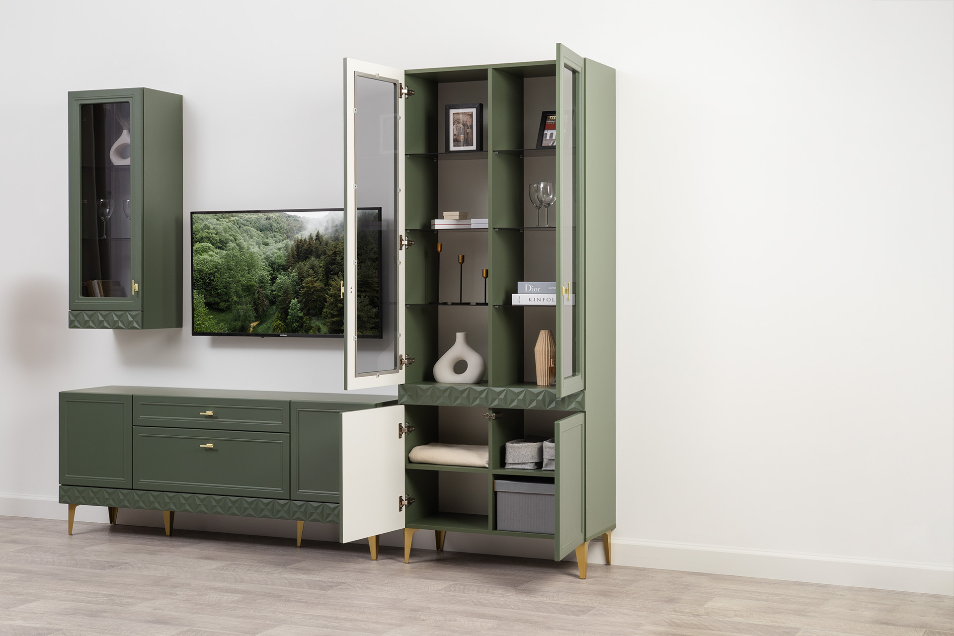 Изящные линии, глубокая фрезеровка фасадов из МДФ и благородные оттенки. Утончённая «Слоновая кость» и изысканная «Олива Шагрень» с глубоким зелёным тоном — создают атмосферу уюта, тепла и благородства. Металлические ручки и опоры золотого цвета придают мебели утончённый блеск, а петли и направляющие с доводчиками обеспечивают плавное и бесшумное закрытие фасадов.