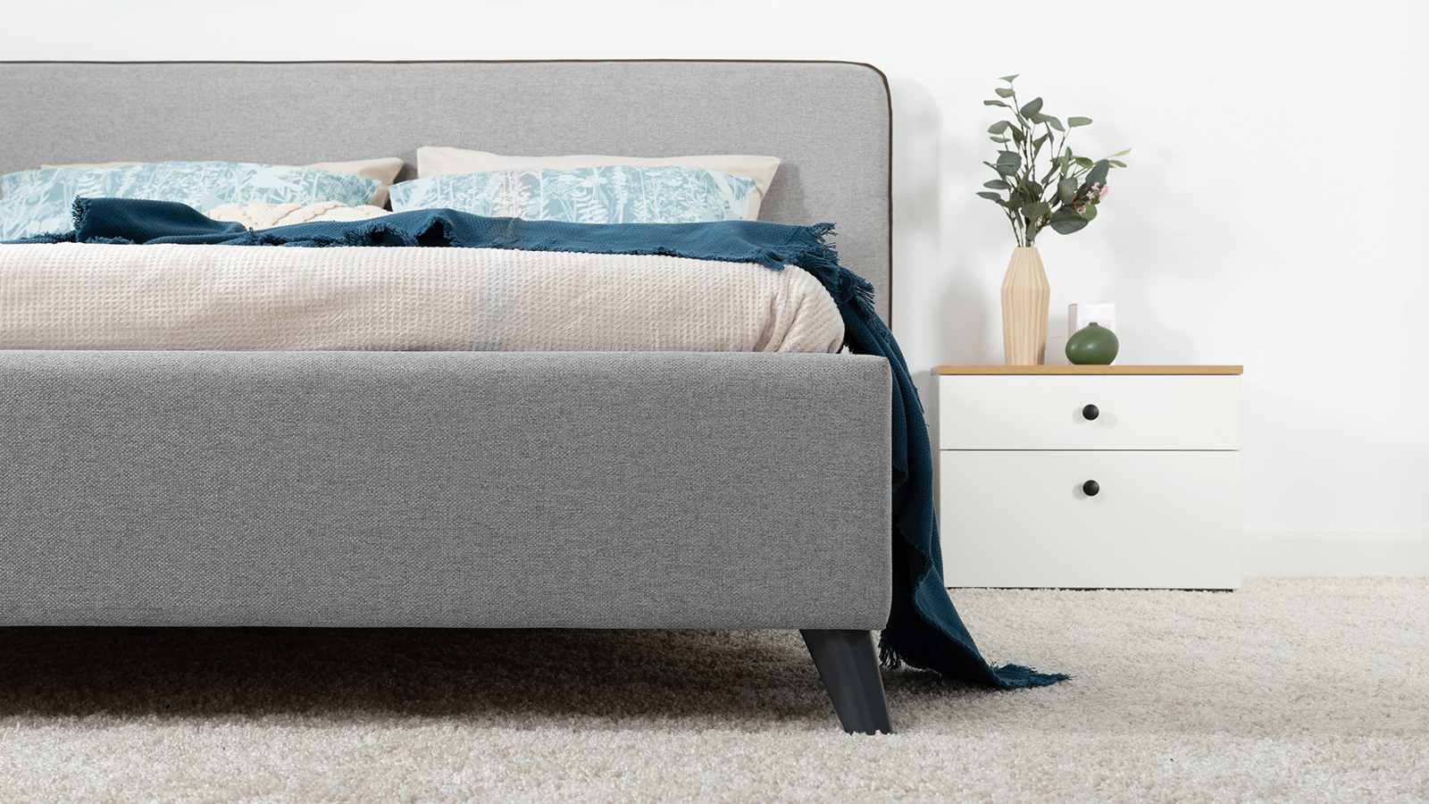 Основание кровати укомплектовано матрасодержателями. Жесткое кроватное дно из МДФ 6 мм. Задняя стенка изголовья выполнена в тех. ткани (спанбонд).