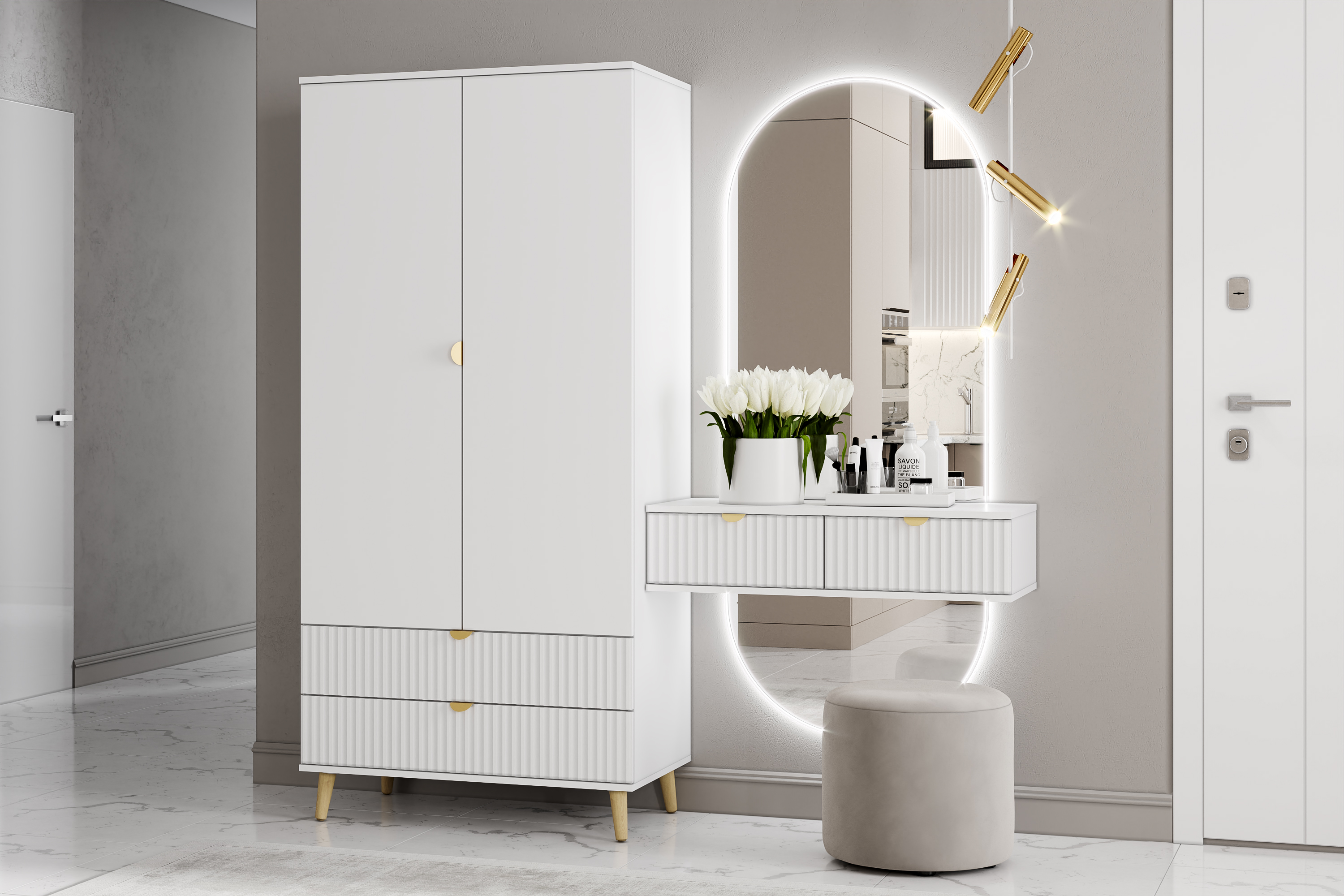 Модульная композиция включает тумбу, оснащенную выдвижными ящиками, которые открываются плавно и бесшумно благодаря шариковым направляющим, а в шкафу удобно организовать предметы одежды, при этом высокие опоры облегчают процесс уборки.