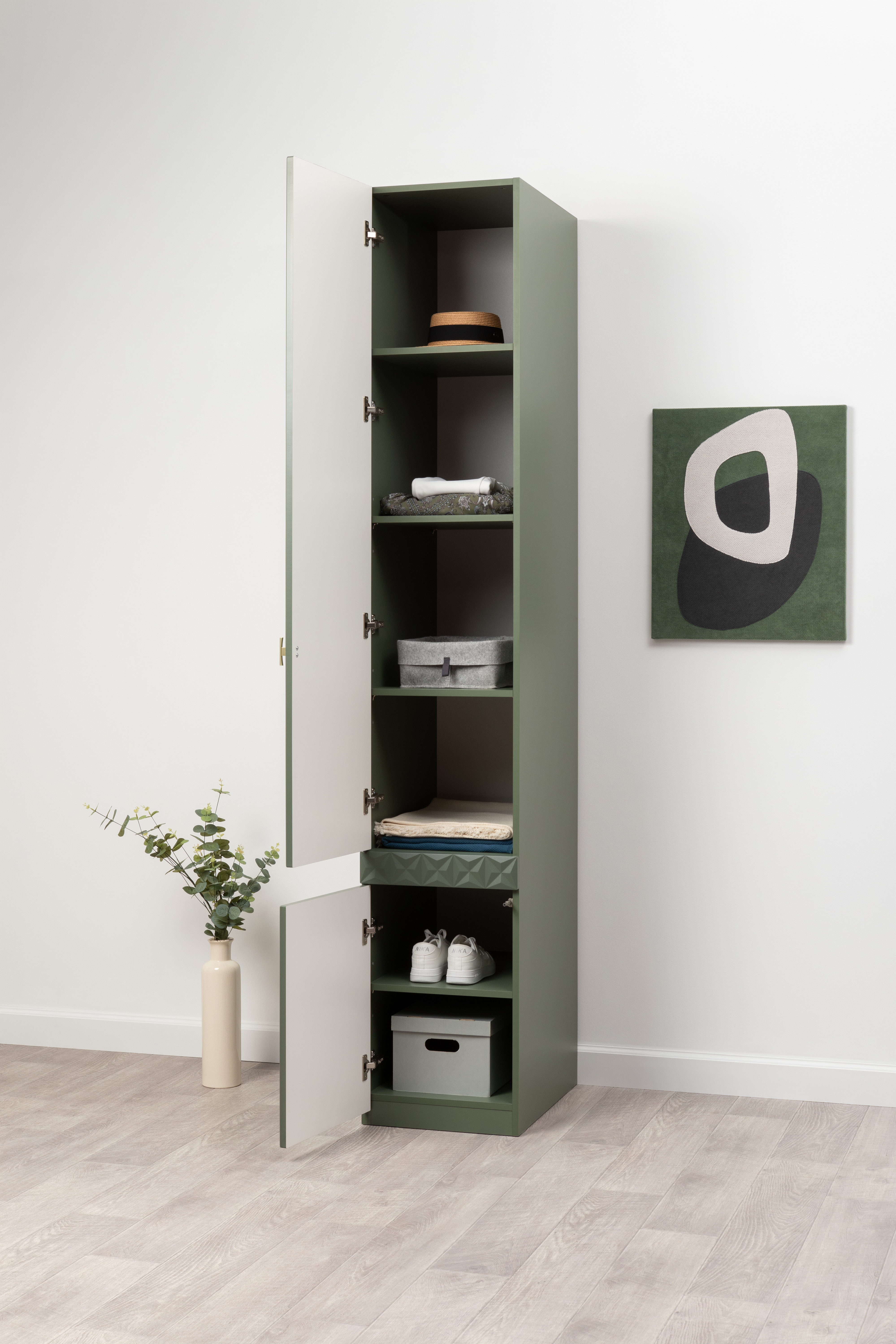 Шкаф-пенал Марион 16.340.01 дымчатый зеленый K521, олива шагрень AG 1050 ПВХ (собирается на любую сторону)