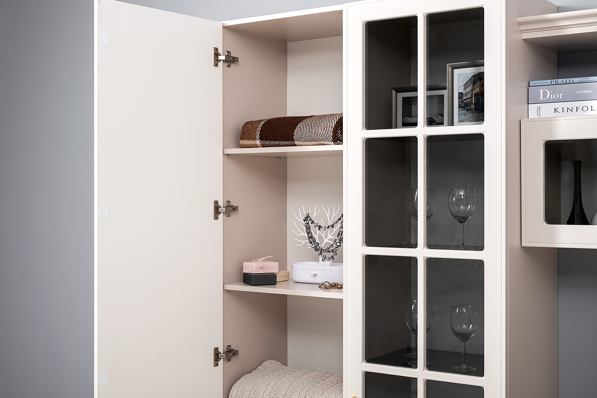 Фрезерованные фасады из МДФ, металлические ручки и витрины с тонированным стеклом создают изысканный образ.