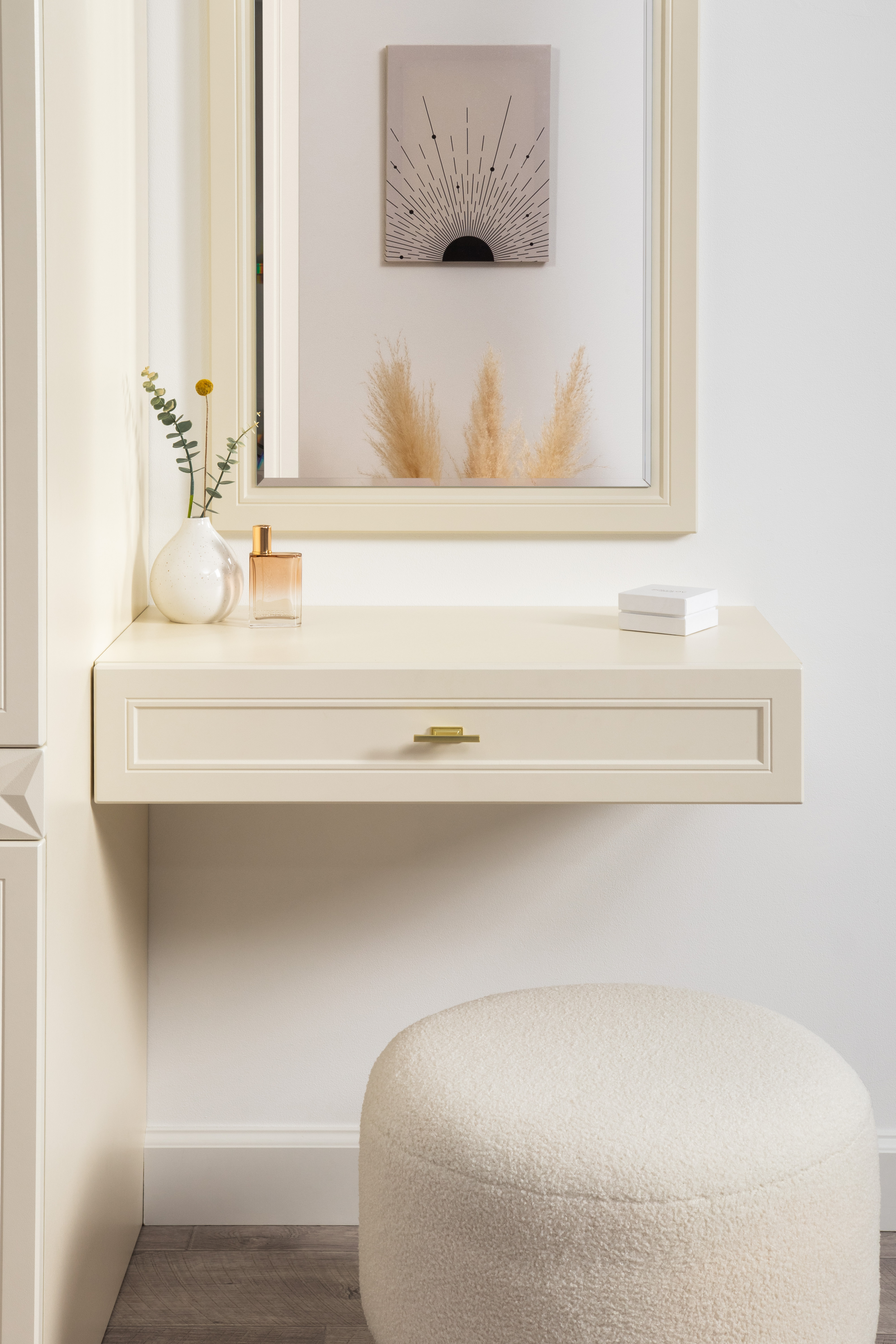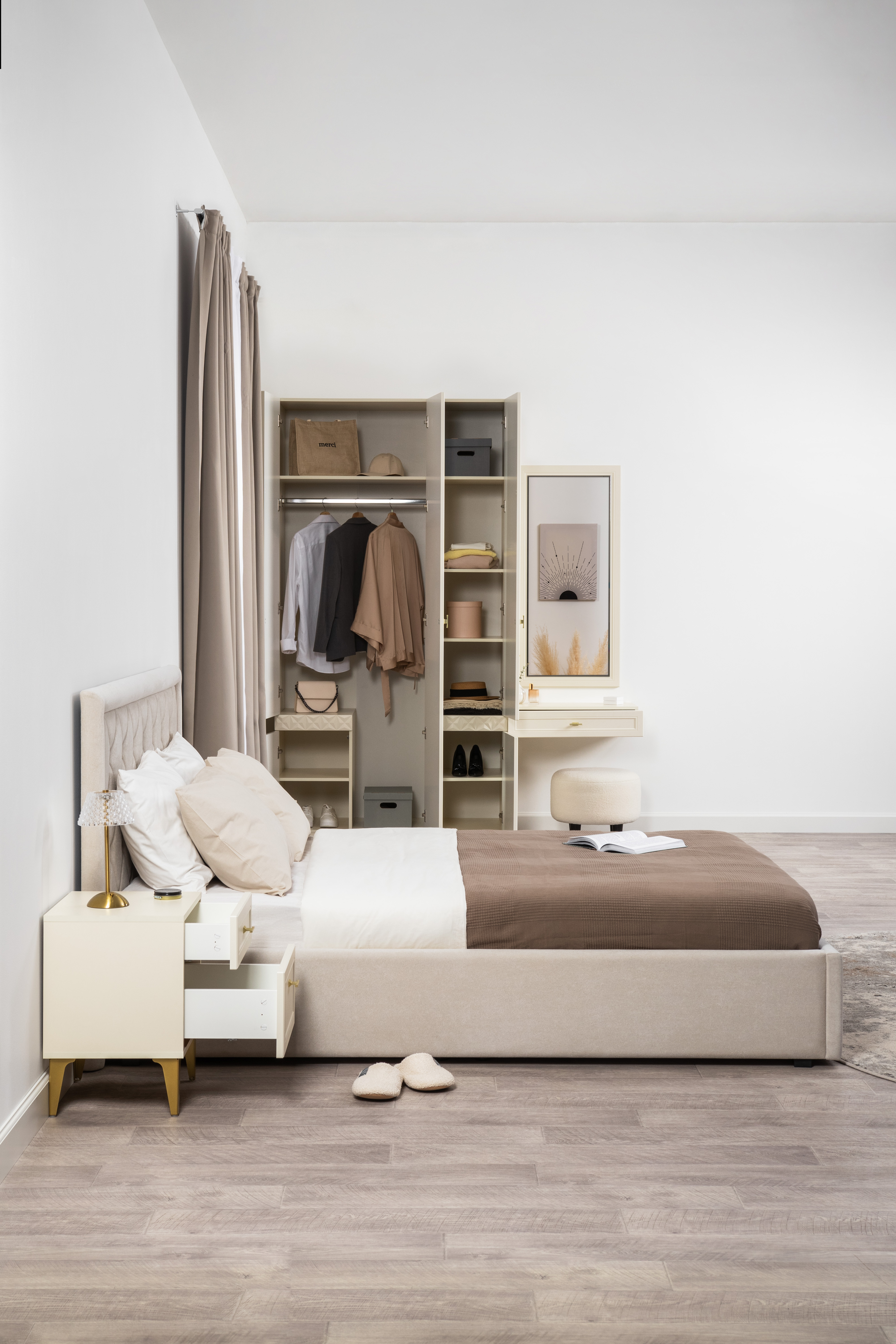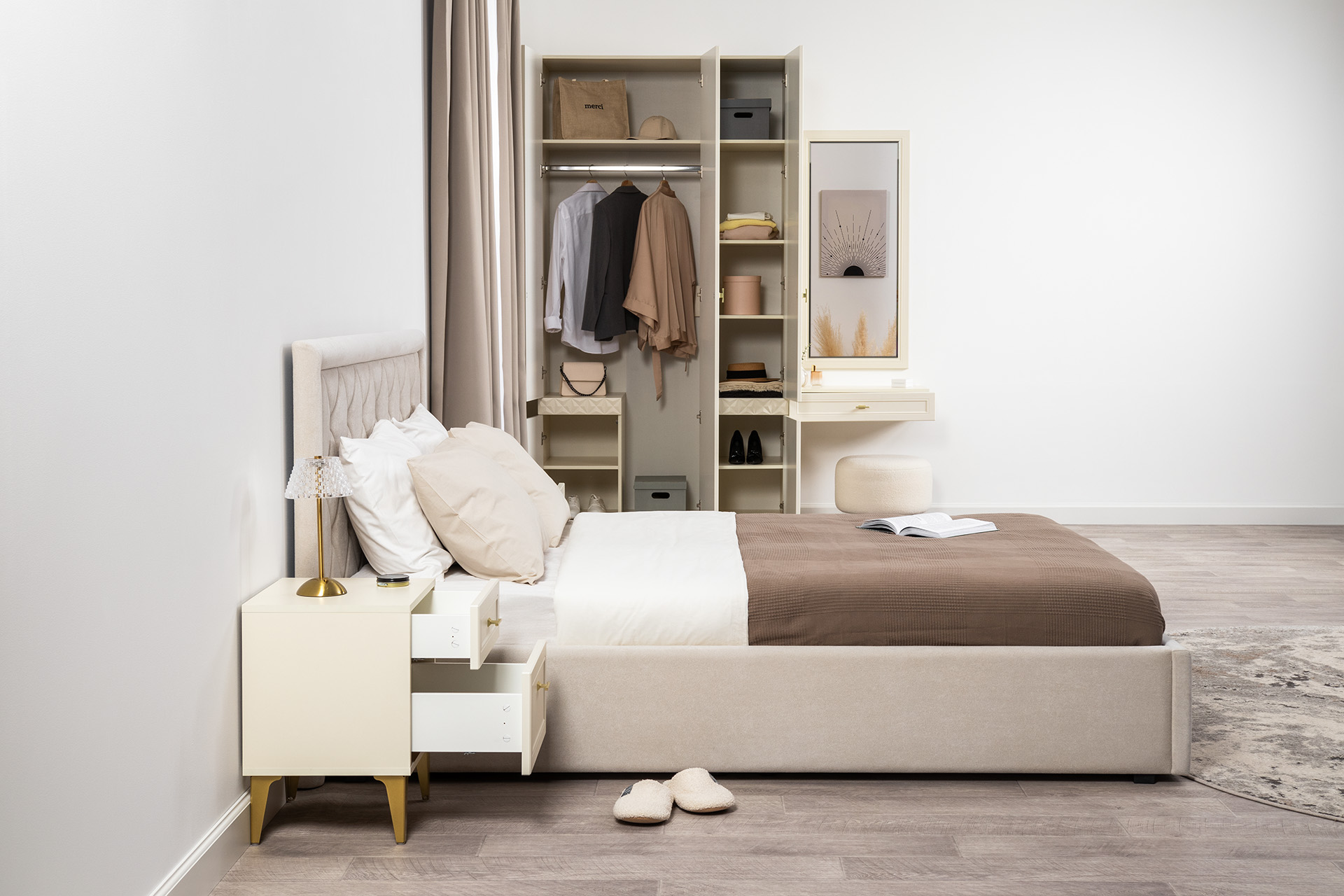 Спальня Дакота композиция 1 меренга, белый, с кроватью Ингрид/Ingrid 1600 велюр ультра смог/ultra smoke, пуф Альба 450 велюр ультра смог/ultra smoke